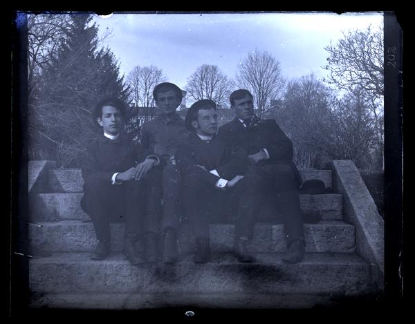 Glass negative showing Theodore William Richards (Haverford College class of 1885), Charles Winter Baily (class of 1885), John Jay Blair (class of 1885), and Lloyd Logan Smith (i.e. Logan Pearsall Smith, class of 1885) seated on stone steps. The men wear three-piece suits and three of the men wear hats. The two men on the right look away from the camera.