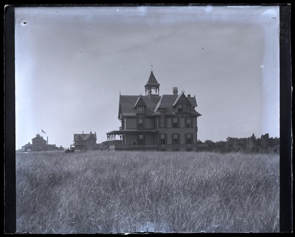 Glass negative showing the Morris family home Avocado, a multi-story Victorian-style house seen from a distance across a field. The house has a wide porch and a tall spire. Other similar houses are visible in the distance. Elliston Perot Morris bought property in Sea Girt, N.J. in 1875, where he built the summer home Avocado after designs by Quaker architect Hibberd Yarnall. Morris left Avocado, named after a Perot family estate in Bermuda, to his daughter Elizabeth Canby Morris in his will. It was sold in 1947 after her death. By 1958 the house had been demolished.