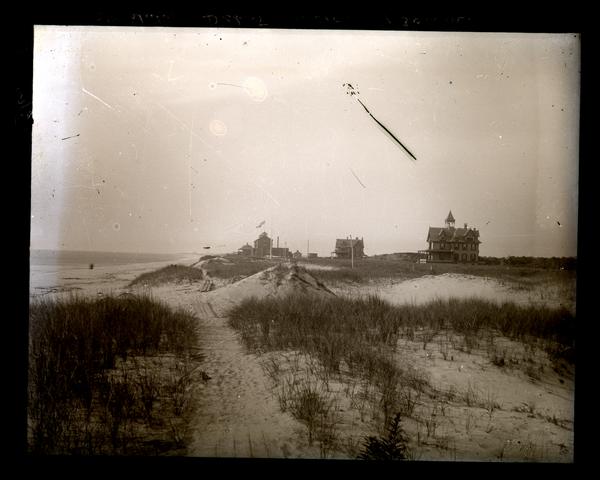 Glass negative showing a view of a group of large houses, including Morris family home Avocado and the Beach House, seen from a distance across a wide field of dune grass at Sea Girt, N.J. A path interspersed with wooden planks winds toward the houses and the ocean is visible on the left. Elliston Perot Morris bought property in Sea Girt, N.J. in 1875, where he built the summer home Avocado after designs by Quaker architect Hibberd Yarnall. Morris left Avocado, named after a Perot family estate in Bermuda, to his daughter Elizabeth Canby Morris in his will. It was sold in 1947 after her death. By 1958 the house had been demolished. Robert Stockton bought the land of what would become Sea Girt in 1853. After his death in 1866, developers bought the land and in 1875 the Sea Girt Land and Improvement Company took over Stockton’s old mansion, added wings to either side, and renamed it the Beach House. The Beach House was a popular hotel for many years, reopening in 1920 as Stockton Hotel. It burned down in 1965.