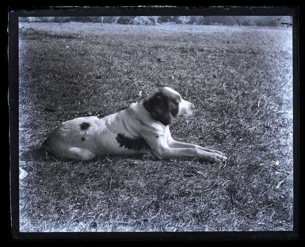 Glass negative showing Dash, a medium-sized a piebald dog owned by John F. Haverty laying in the grass.
