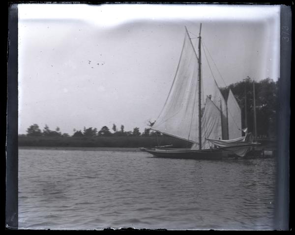 Glass negative showing various sailboats docked at the edge of the Manasquan River. The far shore is lined with trees.