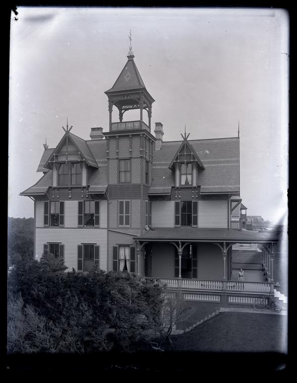 Glass negative showing a side view of the Morris family home Avocado, a multi-story house featuring a wide porch, a tower with a balcony and tracery decoration. A woman stands on the porch and a bicycle leans against the railing beneath her. Trees grow on the left side of the house. Elliston Perot Morris bought property in Sea Girt, N.J. in 1875, where he built the summer home Avocado after designs by Quaker architect Hibberd Yarnall. Morris left Avocado, named after a Perot family estate in Bermuda, to his daughter Elizabeth Canby Morris in his will. It was sold in 1947 after her death. By 1958 the house had been demolished.