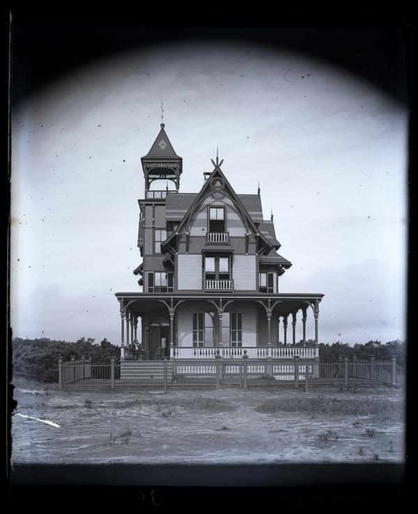 Glass negative showing the Morris family home Avocado, a multi-story house with a wide porch, a tower with a balcony and tracery decorating the gables, as seen from the front. A fence surrounds the house separating it from the dune grass in front and the trees behind. A man sits on a chair on the left side of the porch. Elliston Perot Morris bought property in Sea Girt, N.J. in 1875, where he built the summer home Avocado after designs by Quaker architect Hibberd Yarnall. Morris left Avocado, named after a Perot family estate in Bermuda, to his daughter Elizabeth Canby Morris in his will. It was sold in 1947 after her death. By 1958 the house had been demolished.