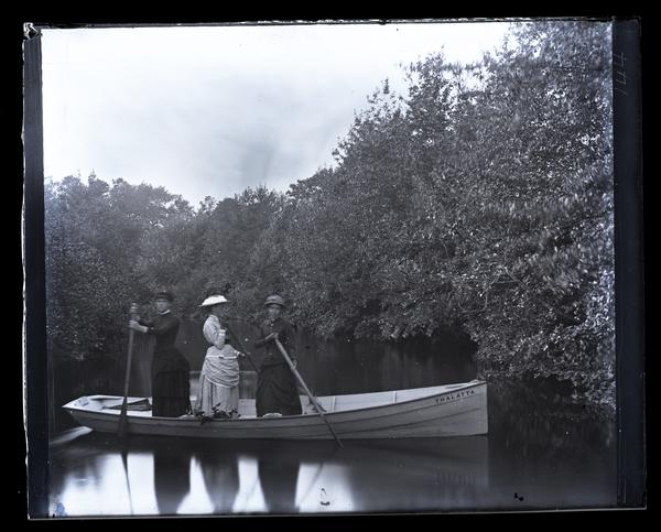 Glass negative showing three women standing in a canoe named "Thalatta" floating in a creek with still waters. All three women wear hats and long dresses carry oars. The creek is surrounded by trees.