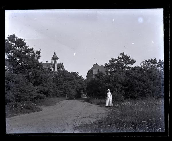 Glass negative showing a road leading toward two houses, the Morris family home Avocado and a house owned by Charles and Phoebe Wright. The Wright's house on the right is made of brick and has a crenellated roof and Avocado on the left has a tall tower with a balcony. Marriott C. Morris' sister Elizabeth Canby Morris stands on the road in front of tall trees that obscure all but the rooftops of the houses. Elliston Perot Morris bought property in Sea Girt, N.J. in 1875, where he built the summer home Avocado after designs by Quaker architect Hibberd Yarnall. Morris left Avocado, named after a Perot family estate in Bermuda, to his daughter Elizabeth Canby Morris in his will. It was sold in 1947 after her death. By 1958 the house had been demolished. Charles Wright began the construction of this house in 1885. Phoebe Wright was not directly related to him, but lived here until the construction of her own house in 1890.