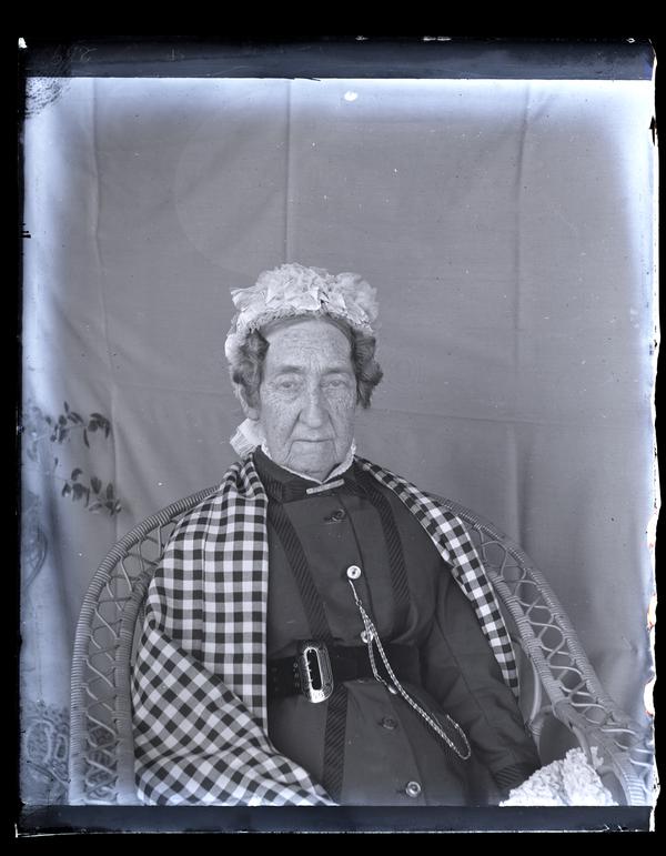 Glass negative showing a three-quarter length portrait of Marriott C. Morris' grand-aunt Hetty Ann Bellah. She sits in a wicker chair and wears a belted dress, floral cap, and checkered shawl.
