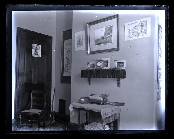 Glass negative showing the corner of Marriott C. Morris' room in Barclay Hall at Haverford College. On the left there is a door and a chair; on the right is a small table holding magazines and what appears to be a large wooden spoon. Above the table is a shelf holding framed pictures and a clock, and on the wall are various other framed pictures. Barclay Hall was built in 1877 to expand the living quarters of Haverford College, originally founded in 1833.