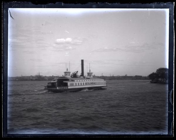 Glass negative showing a ferry traveling down the Delaware River. The letters on the hull of the boat read "Columbia."