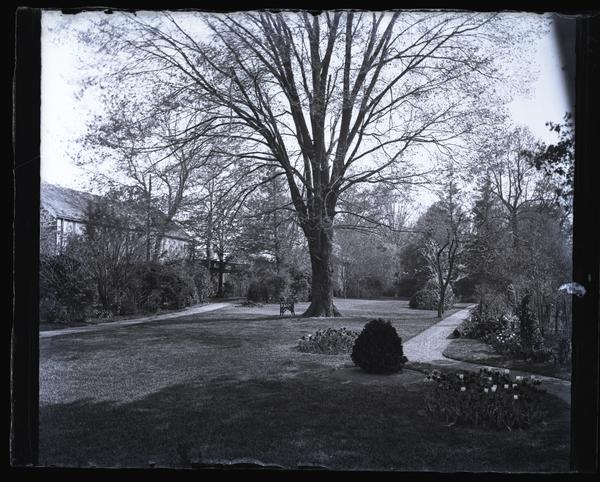 Glass negative showing a garden at the Deshler-Morris House at 5442 Germantown Avenue. A large tree stands in the center. A metal bench sits under the tree to the left and a path winds to the right. To the left of the path are two flower beds and a shrub. David Deshler built the original four-room summer cottage on this Germantown lot in 1752, adding the three-story front addition in 1772. The house was sold to Col. Isaac Franks in 1792 after Deshler’s death. President George Washington rented the home for the duration of the yellow fever epidemic of 1793 and the summer of 1794. Elliston and John Perot purchased the house in 1804, selling it to Elliston’s son-in-law Samuel B. Morris after his death in 1834. The house stayed in the possession of the Morris family for over a century, when Elliston P. Morris donated the house to the National Parks Service in 1948. The name was officially changed to the Germantown White House in 2009.