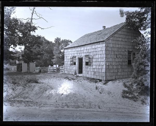 Glass negative showing Old Friend's Meeting House in Manasquan, N.J., a small one-story wooden building with a wooden fence with a gate to the left. Trees line the background and a dirt road runs in front of the building. The Manasquan Friends Meeting House was built circa 1730. Originally a two-story structure, it was remodeled into a one-story building in 1812 after storm damage in 1808. The original Meeting House was sold in 1885 and a new building built a year later.