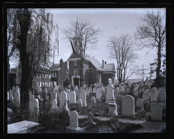 Glass negative showing a cemetery in front of the brick church building of Gloria Dei, also known as Old Swedes', Church. The cemetery is dotted with trees and contains many gravestones of various sizes. Gloria Dei, founded in 1677, was built 1698-1700 after the designs of John I. Harrison. Originally a Swedish Lutheran church, it became Episcopal in 1845.