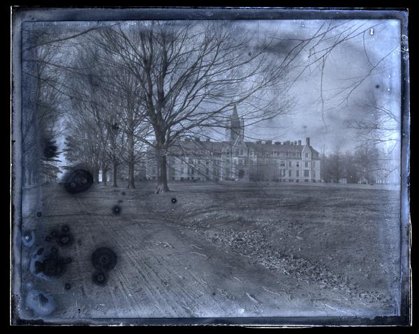 Glass negative showing an open field to the right and Barclay Hall in the distance, a large stone residential hall at Haverford College with a rounded entryway and a prominent spire. A path lined by trees and scored with wheel tracks is visible in the foreground. Barclay Hall was built in 1877 to expand the living quarters of Haverford College, originally founded in 1833.