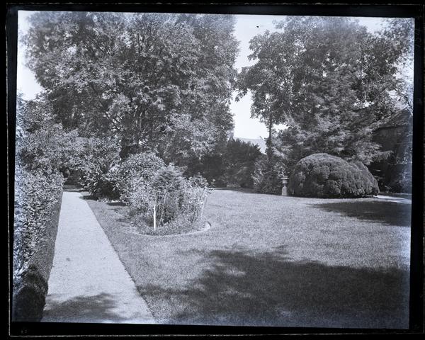 Glass negative showing a garden at the Deshler-Morris House at 5442 Germantown Avenue. A path lined with flowerbeds and shrubs runs across the left side of the grass. Trees and other shrubs form the outer border of the garden. David Deshler built the original four-room summer cottage on this Germantown lot in 1752, adding the three-story front addition in 1772. The house was sold to Col. Isaac Franks in 1792 after Deshler’s death. President George Washington rented the home for the duration of the yellow fever epidemic of 1793 and the summer of 1794. Elliston and John Perot purchased the house in 1804, selling it to Elliston’s son-in-law Samuel B. Morris after his death in 1834. The house stayed in the possession of the Morris family for over a century, when Elliston P. Morris donated the house to the National Parks Service in 1948. The name was officially changed to the Germantown White House in 2009.