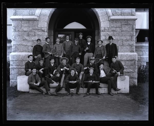 Glass negative showing the Haverford College class of 1888, a large group of young men posed in rows on a set of steps at the residential hall, Barclay Hall. Some hold cricket bats and racquets. The back row stands while the front two rows sit on the steps. Some of the men hold racquets and cricket bats. They wear three-piece suits and hats. Barclay Hall was built in 1877 to expand the living quarters of Haverford College, originally founded in 1833.