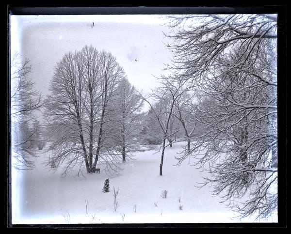 Glass negative showing a snowy field seen from above and dotted with trees at Haverford College (founded 1833). A metal bench sits under the large tree to the left.