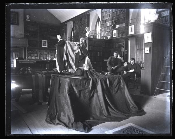 Glass negative showing a table covered with a cloth and displaying a trophy, cricket bat, and flags in the Magill Library at Haverford College (founded 1833). Two men sit to the right of the table in the library. Books line the walls. Magill Library was built in 1864 as a library and assembly hall.