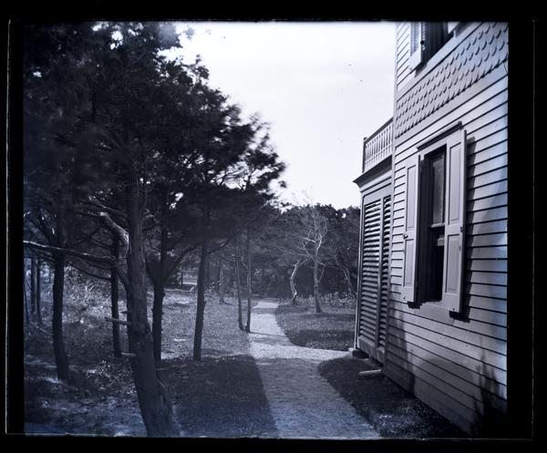 Glass negative showing a path running along the side of the Morris family home Avocado. Trees grow on either side of the path. Elliston Perot Morris bought property in Sea Girt, N.J. in 1875, where he built the summer home Avocado after designs by Quaker architect Hibberd Yarnall. Morris left Avocado, named after a Perot family estate in Bermuda, to his daughter Elizabeth Canby Morris in his will. It was sold in 1947 after her death. By 1958 the house had been demolished.