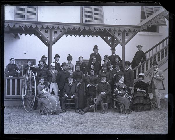 Glass negative showing a large group of men and women gathered on a covered porch decorated with latticework behind Hamilton Hotel. Some of the men and women stand, and others sit on chairs in front of the railing. A bicycle with a large from wheel sits on the left. The women wear long high-necked dresses and hats while the men wear three-piece suits and hats. Frank A. Elwell was part of the League of American Wheelmen and conducted bicycle tours through Europe, America, and Bermuda beginning around 1884. He added ladies tours in 1892.