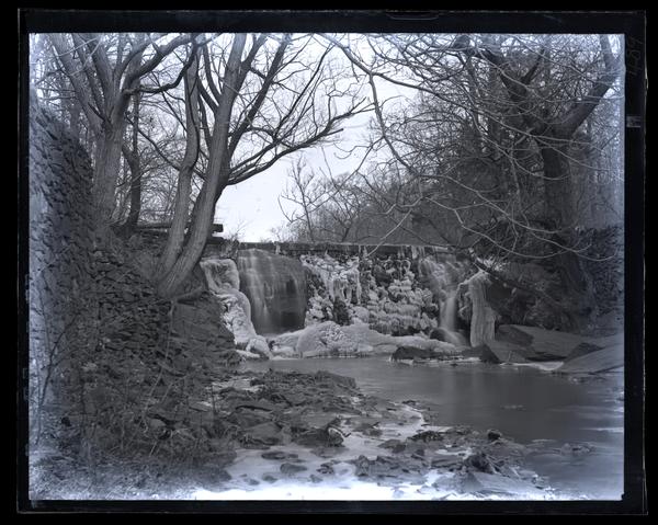Glass negative showing a dam over the rocky riverbed of Mill Creek. Trees surround the dam on either side.