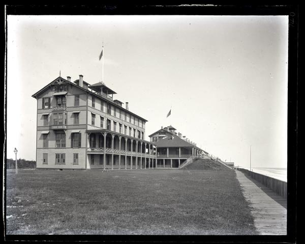 Glass negative showing the Beach House, two large multi-story buildings with a center building standing near the beach. The buildings on the left and right are taller than the center building and fly flags from their rooftops. A low wooden wall next to a boardwalk shields the buildings from the sand below. Robert Stockton bought the land of what would become Sea Girt in 1853. After his death in 1866, developers bought the land and in 1875 the Sea Girt Land and Improvement Company took over Stockton’s old mansion, added wings to either side, and renamed it the Beach House. The Beach House was a popular hotel for many years, reopening in 1920 as Stockton Hotel. It burned down in 1965.
