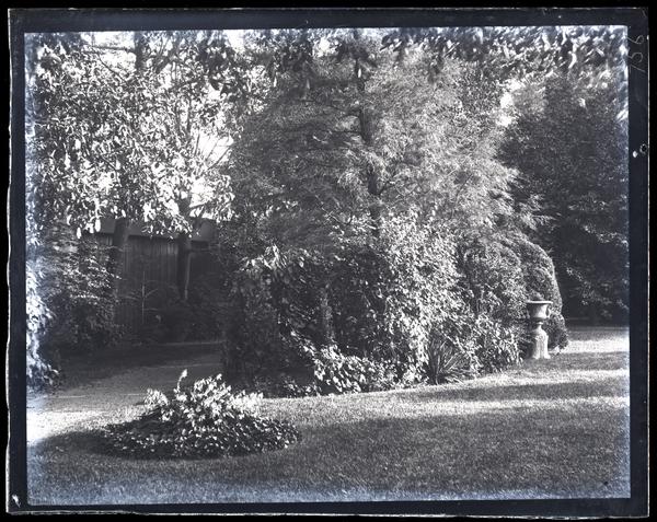 Glass negative showing a garden at the Deshler-Morris House at 5442 Germantown Avenue. Trees and other foliage grow in the center. An urn on a pedestal sits near the trees on the right and a circular flower bed occupies the foreground on the left. A wooden fence is visible through the foliage in the background. David Deshler built the original four-room summer cottage on this Germantown lot in 1752, adding the three-story front addition in 1772. The house was sold to Col. Isaac Franks in 1792 after Deshler’s death. President George Washington rented the home for the duration of the yellow fever epidemic of 1793 and the summer of 1794. Elliston and John Perot purchased the house in 1804, selling it to Elliston’s son-in-law Samuel B. Morris after his death in 1834. The house stayed in the possession of the Morris family for over a century, when Elliston P. Morris donated the house to the National Parks Service in 1948. The name was officially changed to the Germantown White House in 2009.
