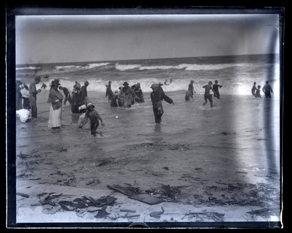 Glass negative showing a group of men, women, and children wading into the ocean as waves break in the distance on Ocean Day. Jersey Wash Day, also known as Salt Water Day or Ocean Day, was an annual event held the second Saturday of August near Wreck Pond in Sea Girt. Farmers living twenty to thirty miles from Sea Girt came to the sea to spend a day bathing and celebrating. The tradition, begun before 1853, stopped around the 1930s.