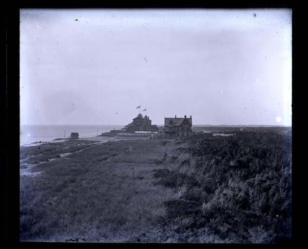 Glass negative showing a multi-story house owned by the Smith family and the Beach House standing on a dune overlooking the sea seen from a distance across a grassy field. Smith's house on the right has a wide porch and the Beach House on the left flies a flag from the roof. A small wooden building stands in front of the houses near to the shore. Robert Stockton bought the land of what would become Sea Girt in 1853. After his death in 1866, developers bought the land and in 1875 the Sea Girt Land and Improvement Company took over Stockton’s old mansion, added wings to either side, and renamed it the Beach House. The Beach House was a popular hotel for many years, reopening in 1920 as Stockton Hotel. It burned down in 1965.