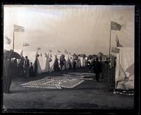Glass negative showing a wide walkway lined with tents, each flying an American flag, at the National Guard Camp in Sea Girt. There is an elaborate design in the center of the walkway and people travel on either side of it next to the tents. The National Guard Camp began in 1884, and the National Guard formally purchased land in 1887 for a permanent summer training camp.
