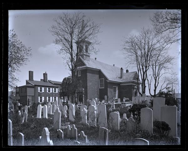 Glass negative showing a cemetery in front of the brick church building of Gloria Dei, also known as Old Swedes', Church. The cemetery is dotted with trees and contains many gravestones of various sizes. Gloria Dei, founded in 1677, was built 1698-1700 after the designs of John I. Harrison. Originally a Swedish Lutheran church, it became Episcopal in 1845.
