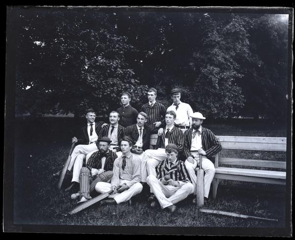 Glass negative showing a group of young men from the Haverford College Cricket Club posed on a bench next to a field. Some of the men hold cricket bats and many of them wear striped suits. Five men sit on the bench while three stand behind and three sit on the grass at their feet. The man on the far left sitting on the ground wears shin pads. Haverford College was founded in 1833.