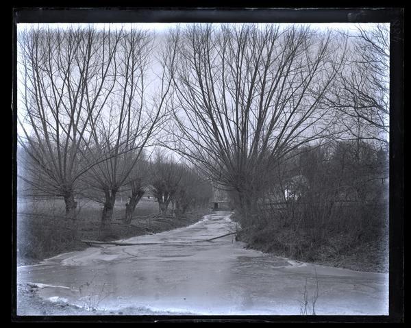 Glass negative showing Mill Creek lined on either side by willow trees. Their branches are bare in the winter weather.