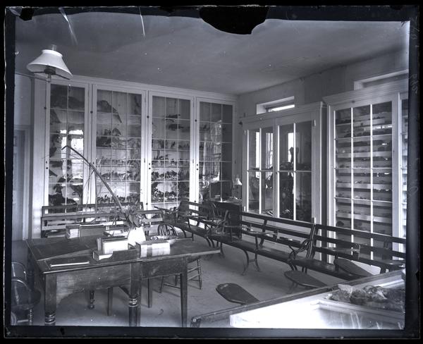 Glass negative showing the museum at Westtown Boarding School, a room with display cases lining the walls. Benches and a desk holding various books occupy the center of the room. Westtown Boarding School, a coeducational Quaker boarding school, opened in 1799. The first building on the campus was designed by David Evans, a Quaker architect. Later buildings included Industrial Hall, built in 1869, and the new main building, built in 1888 after designs by Quaker Addison Hutton (1834-1916). The first diploma was awarded in 1862.