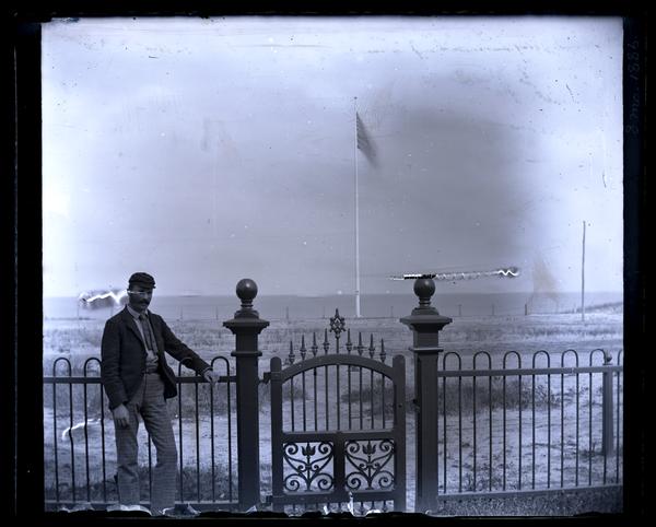 Glass negative showing Marriott C. Morris standing next to the gate in a metal fence at the Morris family home Avocado. Morris wears a hat, plaid pants, and a checkered tie. A flagpole flying an American flag and the ocean are visible in the distance. Elliston Perot Morris bought property in Sea Girt, N.J. in 1875, where he built the summer home Avocado after designs by Quaker architect Hibberd Yarnall. Morris left Avocado, named after a Perot family estate in Bermuda, to his daughter Elizabeth Canby Morris in his will. It was sold in 1947 after her death. By 1958 the house had been demolished.