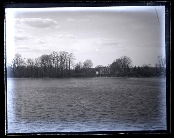 Glass negative showing Marriott C. Morris' second cousin once removed Mary Perot Lardner's two-story home with two chimneys located on the far bank of the Delaware River. The bank is lined with trees and the photo was taken from a distance across the water.