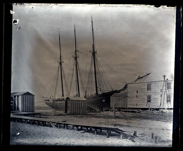 Glass negative showing a boat moored on shore at Atlantic City. Three wooden buildings stand in the foreground and a partially destroyed boardwalk runs across the sand.