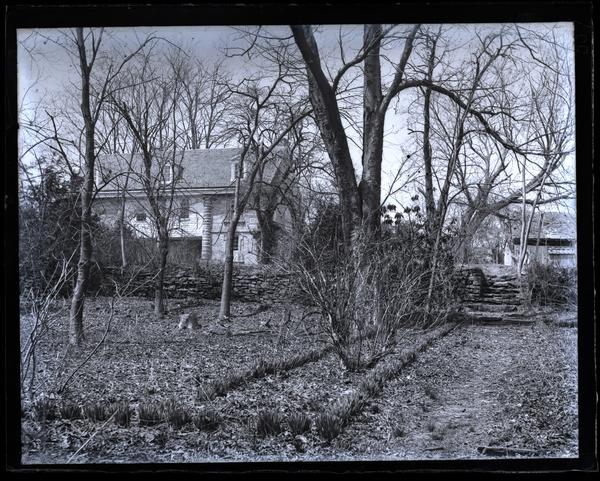 Glass negative showing the Bartram House, a two-story house with large columns on the facade. The house sits behind a low stone wall and a forested area. Bartram’s Gardens, founded by American botanist John Bartram, is the oldest surviving botanic garden in North America. Built in 1728, the gardens cover forty-six acres with a focus in North American plants. The Gardens became a Philadelphia city park in 1891. Bartram’s stone house was originally built 1728-1731.