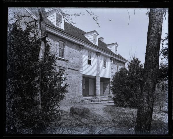 Glass negative showing Bartram's house, a two-story stone house with shallow steps surrounded by foliage. Bartram’s Gardens, founded by American botanist John Bartram, is the oldest surviving botanic garden in North America. Built in 1728, the gardens cover forty-six acres with a focus in North American plants. The Gardens became a Philadelphia city park in 1891. Bartram’s stone house was originally built 1728-1731.