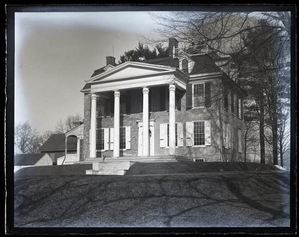 Glass negative showing Old Sherrit House, i.e. Loudoun, at 4650 Germantown Avenue, a two-story house with shuttered windows and two chimneys. The front facade has a covered entryway constructed from columns and a pediment. The house is surrounded by trees, whose branches cast shadows on the lawn. Thomas Armat built Loudoun in 1801 and expanded it in 1810. The Greek portico on the front was added in 1830. Later, members of the Logan family owned and lived in the house. The property was donated to the city of Philadelphia in 1939 as a part of the Colonial Germantown Historic District. It was badly damaged by a fire in 1993 and closed to the public.