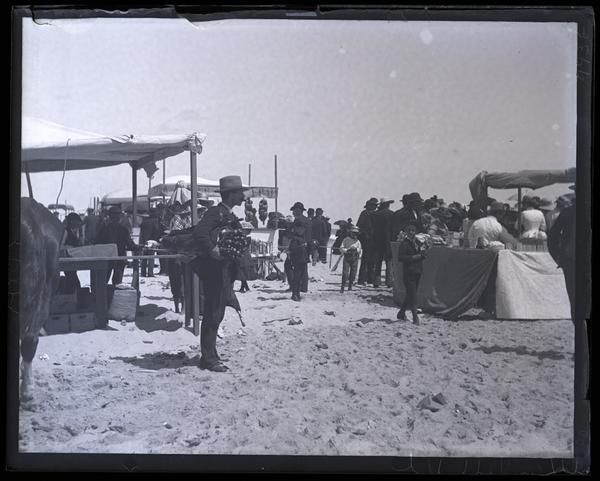 Glass negative showing a crowd of people on the beach for Ocean Day. Men, women and children browse through various stalls set up on either side of a pathway. A man in the foreground holds a pile of wooden sticks bundled in a blanket under one arm. Jersey Wash Day, also known as Salt Water Day or Ocean Day, was an annual event held the second Saturday of August near Wreck Pond in Sea Girt. Farmers living twenty to thirty miles from Sea Girt came to the sea to spend a day bathing and celebrating. The tradition, begun before 1853, stopped around the 1930s.