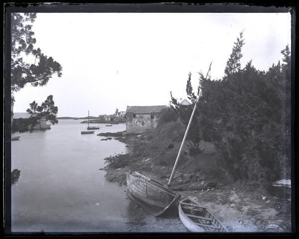 Glass negative showing an inlet at Pitt's Bay with a sailboat and a rowboat in the foreground. Various buildlings and other boats occupy the shoreline in the distance.
