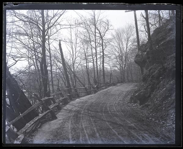Glass negative showing River Road, a dirt lined with wheel tracks. A wooden fence stands on the left with trees behind it and a rocky cliff face borders the road on the right.