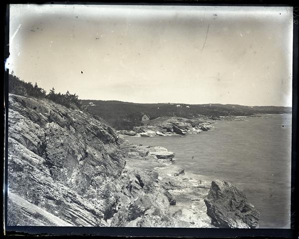 Glass negative showing a rocky coastline at Hungry Bay with a building visible just after the curve in the shore. Grasses grow among the rocks in the foreground.