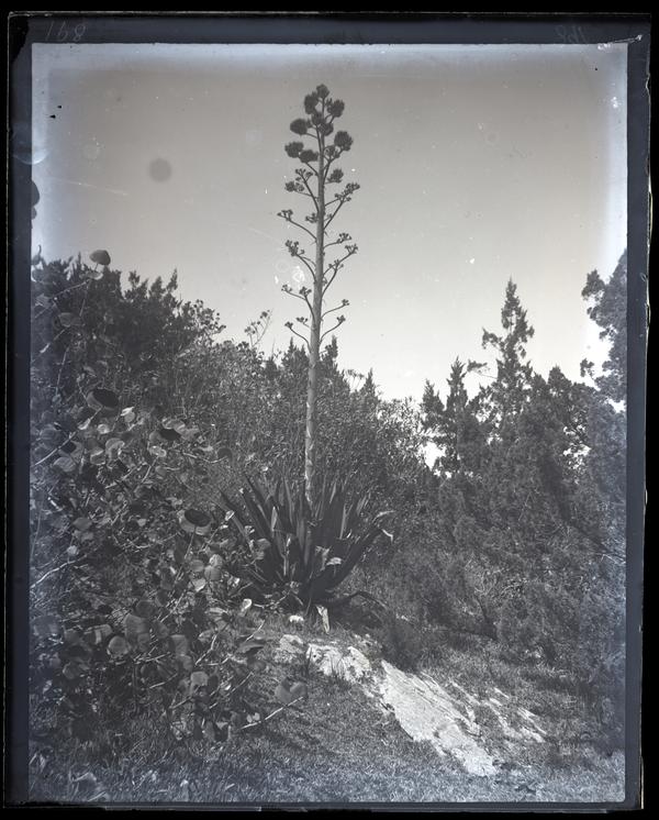 Glass negative showing a leafy agave with a very tall stem at Hungry Bay. The plant is surrounded by other foliage.