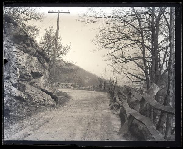Glass negative showing River Road, a dirt road with a wooden fence on the right and a rocky cliff face on the left. Trees stand behind the fence and a telegraph pole stands at the bend in the road on the left.