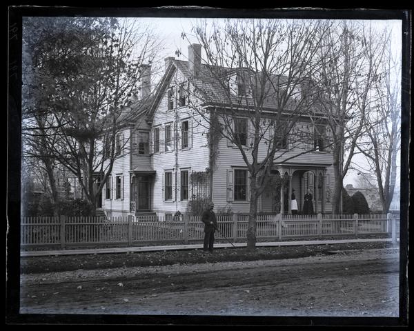 Glass negative showing Marriott C. Morris' uncle Charles Rhoads' two-story house. Ellie and Morris' aunt Deborah Rhoads stand in the covered entryway. A fence separates the house from the road, and a man stands outside it tending to a tree. The Haddonfield area was originally developed by Elizabeth Haddon (1680-1762) who immigrated to the United States in 1701 to manage property her father had bought in the colonies.