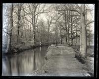 Glass negative showing Brandywine River separated down the center by a long island with a pathway. Trees line the riverbank and there is a small wooden bridge from the pathway spanning the left side of the river.