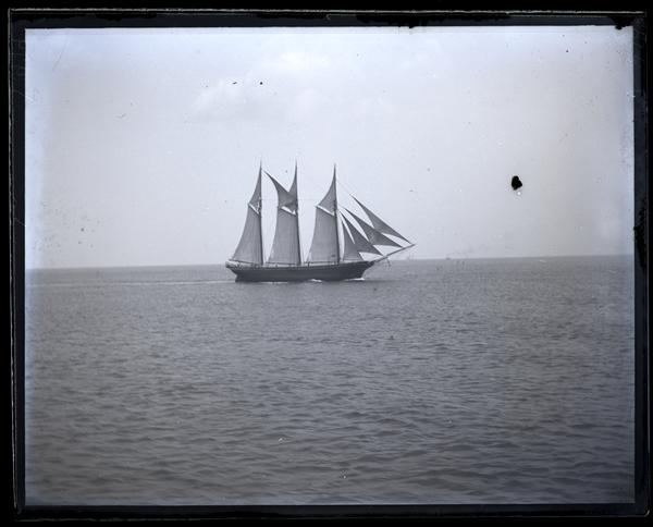 Glass negative showing a schooner with three masts sailing on the ocean at Sea Girt. The ship is seen from a distance across the water.