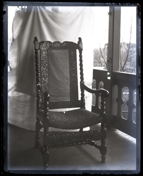 Glass negative showing an elaborately carved chair made by Isaac Marriott with a back made of caning and a cushioned seat. The chair is located on a porch.