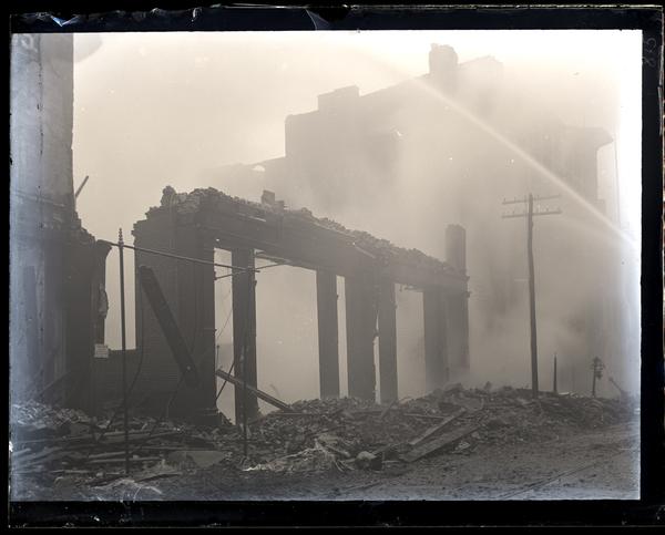 Glass negative showing Marriott C. Morris' father Elliston P. Morris' severely damaged building at 715-719 Arch Street. The pillars of the front facade stand. Piles of rubble lay in front of the ruins. The fire began in the elevator shaft of Morris' building on the night of January 26, 1886, and spread down Arch Street and onto Cherry Street.