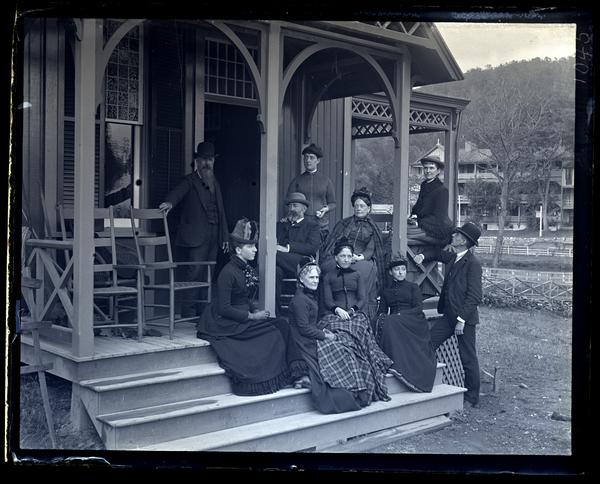 Glass negative showing a group of people gathered on the steps of the Gate House near the Natural Bridge, Va. Five women and one man sit while one woman and two men stand. One woman perches on the porch railing on the left side of the group. The men wear hats and dark suits while the owmen wear high-necked dresses and hats. The Forsest Inn is visible in the background. The Natural Bridge was likely made from an ancient underground river and became a popular tourist destination by the early 19th century. It was once a sacred site of the Monacan tribe. Thomas Jefferson purchased the surrounding land in Cedar Creek, Va. and built up inns for visitors. The Forest Inn, built in 1833, accommodated the large number of visitors to the Natural Bridge. Fire razed the inn 1892.